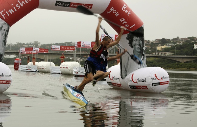 The duo celebrated their win in trademark fashion by standing up in their kayak as they crossed the line and diving into the waters of Blue Lagoon.