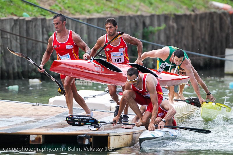 Shortly after, drama came for the Czechs when they capsized as they got their paddles stuck on cables on the starting pontoons. There is only room for four boats on the pontoons; there was chaos when 8 to 10 boats arrived. The two Spanish crews and Van Gysen/Mocke managed to stay in the lead and they didn't let anyone close the gap, in fact expanding it by ten seconds on every lap.