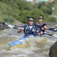 The Dusi Queen's, Robyn Kime (front) and Abbey Ulanski (back), as they have affectionately become known, used all of their experience to claim a hard-fought but close victory over Abby Adie and Anna Adamova at the end of Day One of the 2014 Dusi Canoe Marathon.