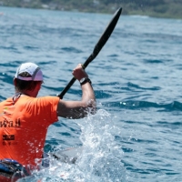 Emerging from his more southerly course, the current and two time defending champion Clint Robinson was not going to give up the title without a fight – a BIG fight. He surged towards Coco Head and as the leaders came together it was clear that Clint was still in the hunt ! Not too far back local hero Pat Dolan also came into view. The young gun was also moving up fast and he actually now looked the strongest of the chase group! And as they rounded China Walls and the head wind hit them all full in the face, 49 year old Oscar Chalupsky was clearly in the lead. Simply unbelievable ! But it wasn’t over just yet….. Oscar was still followed closely by Dean Gardiner. But then another change. Clint Robinson put the hammer down as he entered he bay and quickly overhauled Dean and then set out after Oscar! Oscar was not far in front of Clint now……Surely the five time Olympian and 1992 Olympic 1000m kayak gold medalist would pass Oscar in the flat water ??? But then Clint's speed looked to drop off a little……and almost at the same time Oscar miraculously caught a small bump and edged just a little further ahead ! (We later found out that Clint had been cramping for much of the second half of the race and he could not grip his paddle during the last surge towards the finish line.) Meanwhile, Dean Gardiner was still pushing hard but he was hurting after his huge effort to try and steal the race. Pat Dolan looked like he sensed Deans pain as he firstly came up alongside Dean and then sprinted past him and set out after Clint. What a race!!!