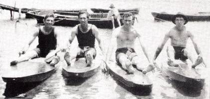 Harry McLaren and his brother Jack used an early version of the surf ski in 1912 for use around the family's oyster beds on Lake Innes, near Port Macquarie, New South Wales, Australia, and the brothers used them in the surf on Port Macquarie's beaches. The board was propelled in a sitting position with two small hand blades, which was probably not a highly efficient method to negotiate the surf. The deck is flat with a bung plug at the rear and a nose ring with a leash, possibly originally required for mooring. The rails are square and there is pronounced rocker. The boards' obvious buoyancy indicates hollow construction, with thin boards of cedar fixed longtitudinally down the board.