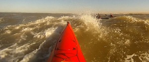 Surfing my conclusions are unchanged: surfing is very nice in long, non-cresting waves. When a wave starts cresting, the kayak broaches quickly; using the rudder or not makes no difference.