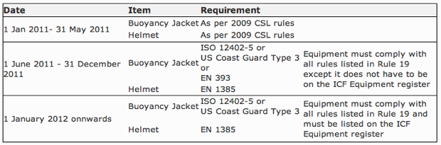 More specifically, the new Rules require that helmets and personal flotation devices (buoyancy jackets) meet ISO standards as implemented in countries around the world. See specifically Rule 19 in the CSL rules.
