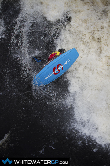 Many gave a sigh of relief as the Grand Prix left Gladiator and arrived at the Ruins, a steep fast wave near downtown Ottawa. The Ruins are formed by a channel of the Ottawa River that gets pushed between an island and a crumbling brick wall from an old mill. Although incredibly fast and dynamic, the feature that forms here seems almost friendly compared to Gladiator. Today competitors will go for a quick surf session before traveling north to the Rouge where the Big Water down-river race will be held tomorrow.