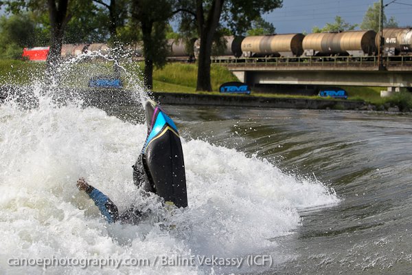 Equally surprising was the upset of four-time World champion Eric “EJ” Jackson (USA). Jackson came into prelims second only to Wright with a score of 1490. Jackson’s showy 630-point third ride in the quarter-finals was not high enough to compensate for two earlier low-scoring rides. In quarters, paddlers get three rides and the best two count. Jackson’s 1093 point total put him in 11th place, five points behind Martin Koll (GER) whose 1036 was just enough to earn him the last semi- final berth.
