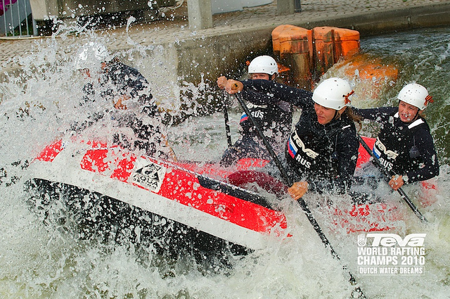 Teva World Rafting Championship has 29 countries represented with 29 men and 15 women teams. The inaugural Teva Youth World Championship has 13 countries represented with 13 men’s teams and 5 women’s. The opening ceremony held in the Flowrider area of Dutch Water Dreams is still going with the official team photos being taken while they surf the Flowrider. Take a look at the photos on the Teva Benalux flickr site and see for yourself. The opening ceremony which was short and sweet is setting up to be a fantastic event with a lot of energy and one spicy slalom course.